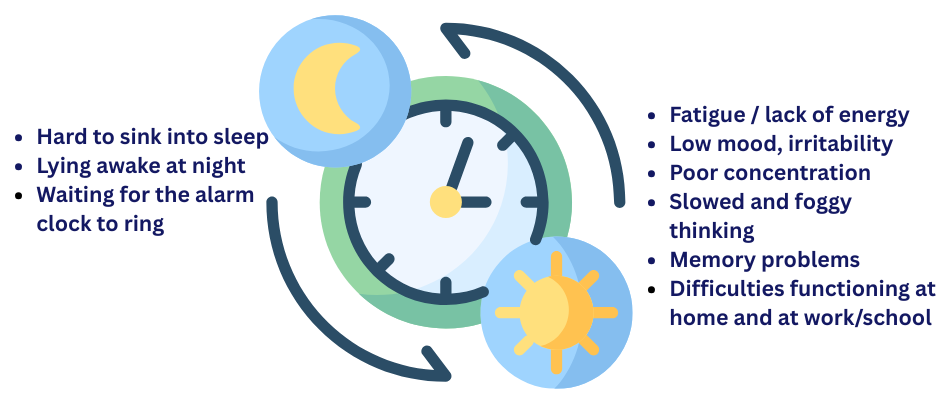 If you have insomnia disorder, you feel clear impacts of this lack of sleep during the day. For instance, you may be exhausted, yet unable to nap. You may feel like you have no energy and that everything requires more effort. Your thinking skills may become less reliable, with a foggy mind, poor concentration, and memory problems. Your mood may switch to the low side and perhaps you become more irritable than usual. This can put a strain on your relationships, your performance at work or at school, and your overall quality of life.