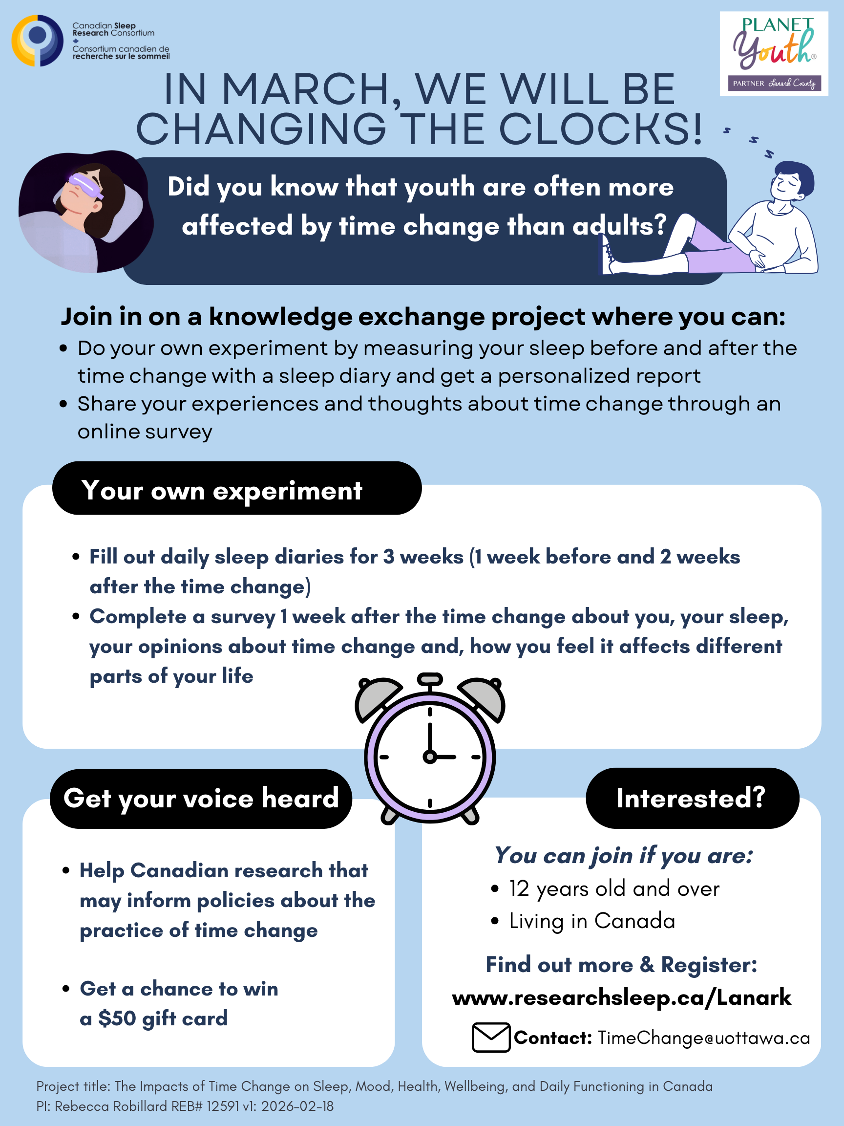 Explore how time change affects you — learn, experiment, and share your voice. Help shape the future of time change in Canada.